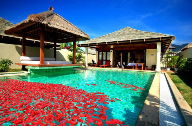 情侶別墅大床房,面積71平方米,獨立院宅,大床(2*2米),有浴缸 免費寬帶,此房型特點:1房1廳1衛(wèi)1露天浴,設(shè)有廚房,和獨立庭院及泳池,高大植物及圍墻,私密性極高。